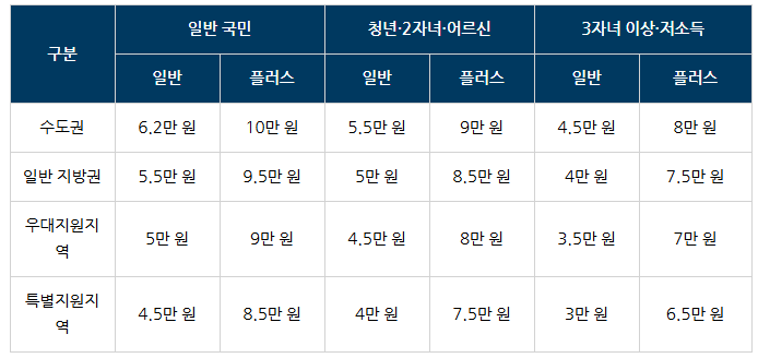 수도권, 일반 지방권, 우대지원지역, 특별지원지역 순이며, 일반 국민, 청년·어르신, 다자녀·저소득층에 따라 차등 적용됩니다.