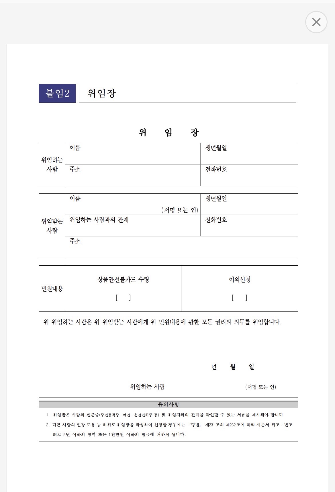 - 위임장 작성 시 신청자 서명 또는 날인 필수