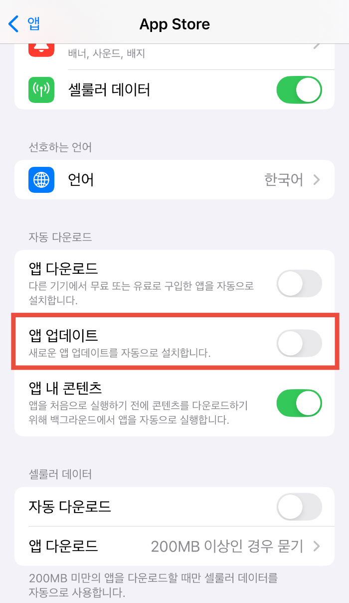 - 자동 다운로드 → ‘앱 업데이트’ 스위치 해제