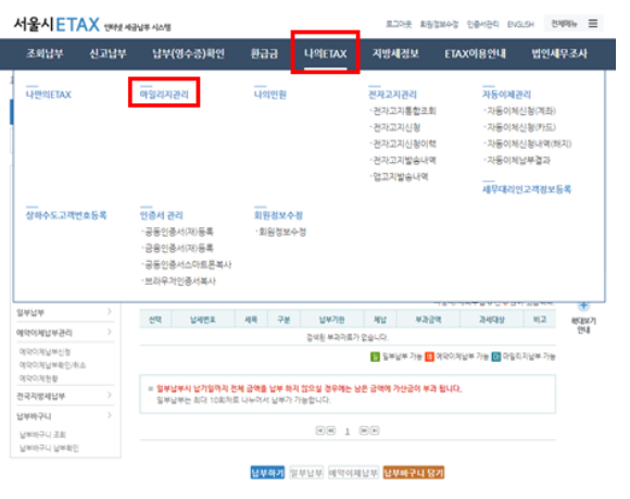 ② 로그인 후 나의 ETAX → 마일리지관리 클릭